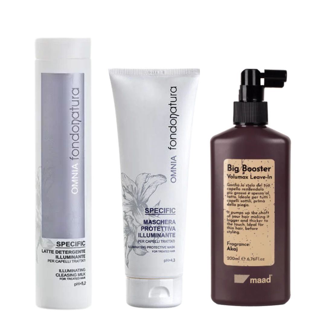 Šis rinkinys – tai trijų produktų ritualas plaukams, kurie prarado žvilgesį, atrodo pavargę ar neteko apimties. Švelniai valantis ir švytėjimo suteikiantis Fondonatura Illuminating šampūnas, maitinanti Illuminating kaukė ir kultinis MAAD Big Booster purškiklis sukuria efektą, tarsi būtum ką tik iš salono.