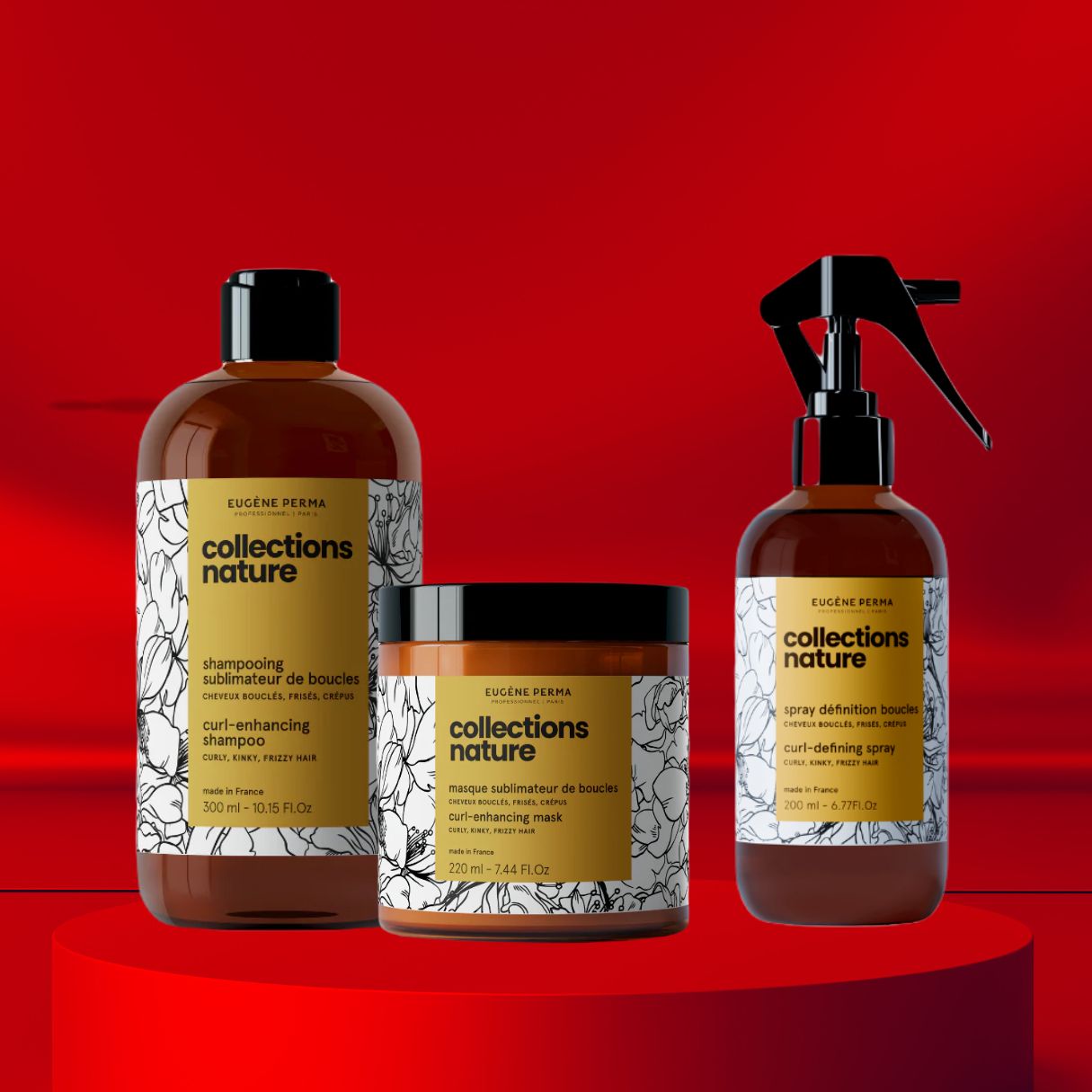 Natūralios sudėties (95–96 %) garbanų priežiūros rinkinys: šampūnas, kaukė ir purškiklis. Atkuria garbanų formą, minkštumą ir drėgmę be silikonų.